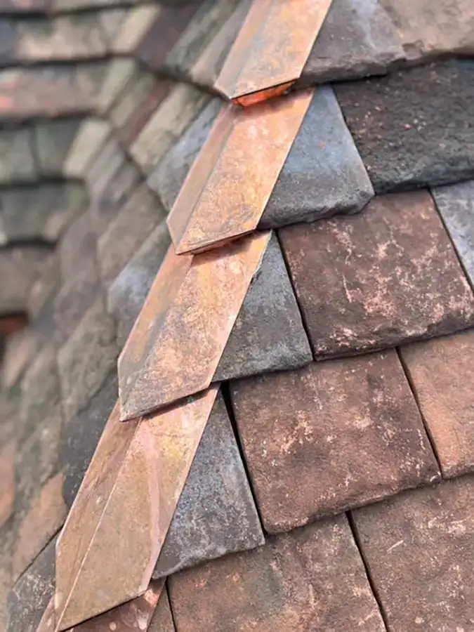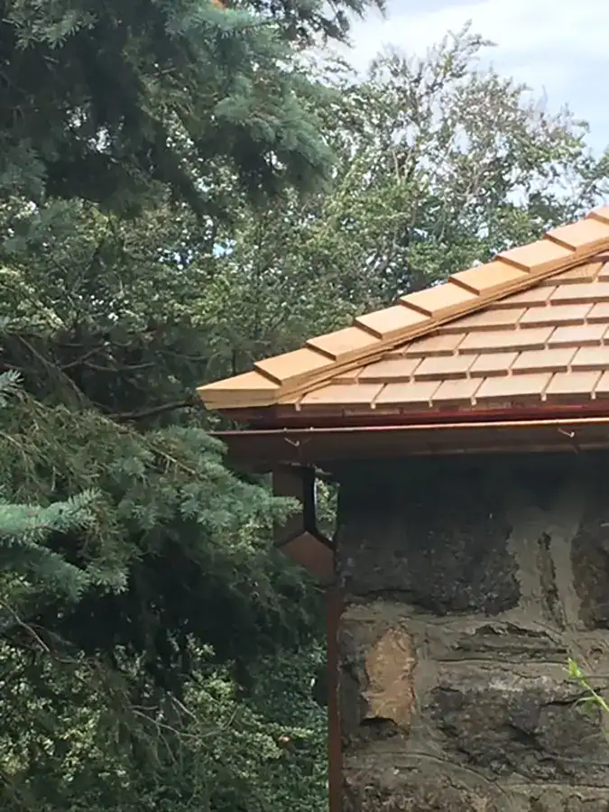 Our scope is broad, but we spend the majority of our time in relatively narrow areas within the specific crafts. On the roofing side, in the area of historic restoration and preservation, we have discipline-specific artisan specialists that spend their time working on slate roofs, clay tile roofs, wood shingle roofs, copper roofs, coppersmith flashing work, and copper gutter and leader drainage systems – the bespoke artisanal areas of roofing and copperwork sector relative to roofing. Our roofing artisans spend 80% of their time within these disciplines. The other 20% of their time is spent on traditional roofing disciplines on typical homes, including asphalt shingle roofs and flat roofing. The flat roofing tends to be in the area of highly complex, bespoke type-flat roofing. For example, we have worked on a lot of Frank Loyd Wright homes, most of which have highly complex flat roofs.
