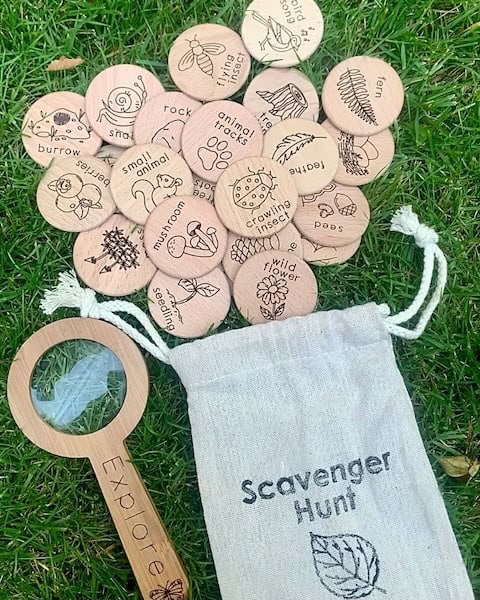 “Your child will love exploring out in nature with these fun, hands on wooden scavenger hunt discs. Each set includes twenty four 2″ hardwood discs that have been laser engraved with 24 different items to search for in the forest. This small and lightweight set is perfect for throwing in your bag to take along on all of your adventures and great for taking the classroom outdoors!”