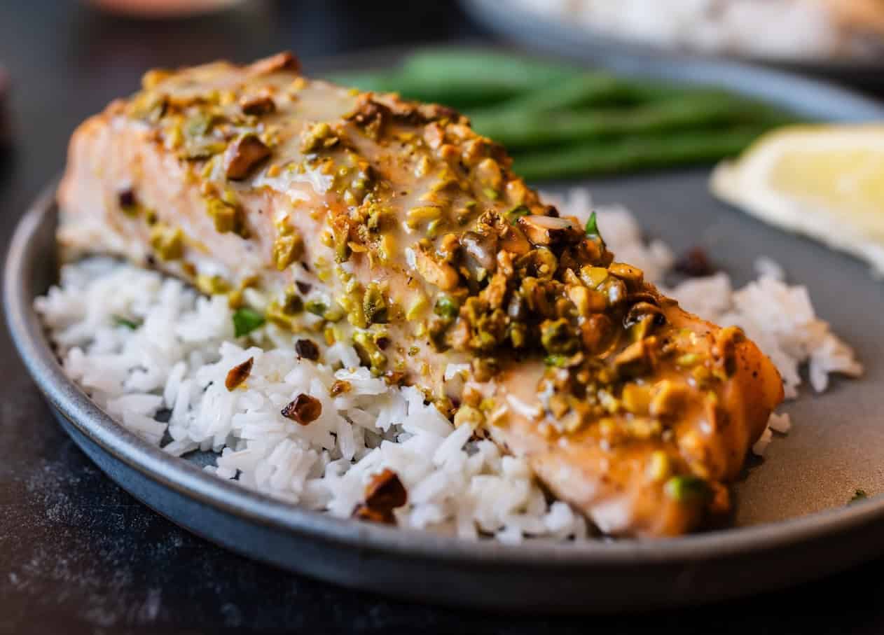 The salmon itself couldn’t be simpler: a drizzle of olive oil, a coating of finely chopped pistachios, and a sprinkle of salt and pepper. Bake, then serve it over rice with your favorite vegetable. Drizzle that luscious lemon beurre blanc over everything, yes, even the veggies!