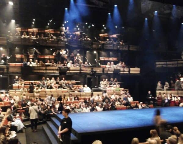 The theatre layout is a thrust stage, meaning that the stage juts out from one wall from which actors enter and exit, with seating for the audience on the other three sides. Actors also came up from the floor via moving platforms and from other entrances around the theatre, making for dynamic blocking. The atmosphere itself was surprisingly intimate, and Abby and I both noted how surprised we were that our seats, which were in the closest of the three sections—a floor section and two balcony levels—were really close to the stage. Considering how many people were socializing before the performance, the theatre was actually quite small, but it was comfortable seating-wise and this closeness caused a striking effect once the show began.